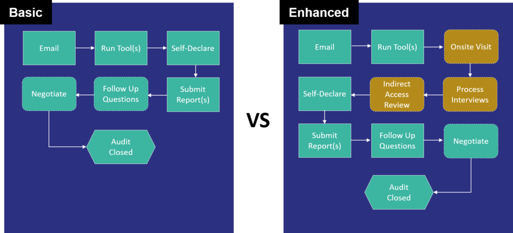 For an Enhanced audit, additional steps have been observed. An onsite visit could be required, though often a remote audit is sufficient, in which SAP will look to understand how your organization uses SAP software. The activities here will vary depending on the scope, but may include interviews to understand how your processes work for Indirect Use, HANA functionality if licensed by Runtime Edition, or how you assign your Named User licenses.